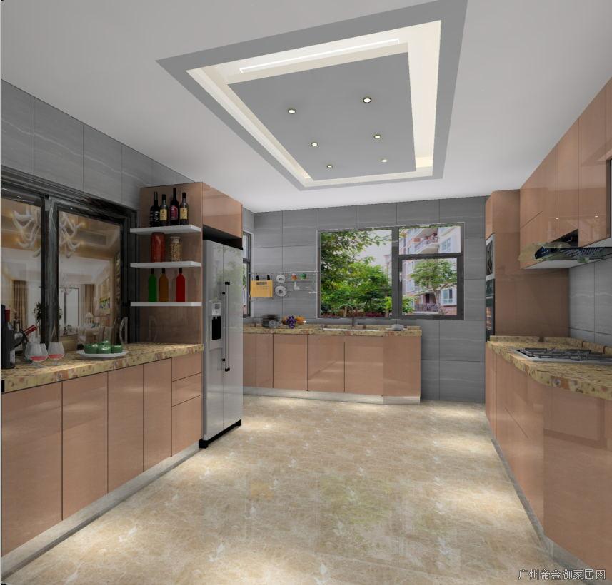 櫥柜為開放式,空間寬裕,右邊為工作區與烹飪區,窗口下是洗滌區,在洗碗時看看窗外不會顯得那么枯燥無味。櫥柜門板采用光面晶鋼板,晶鋼板門板板材最大的特點就是極具防撞防刮。櫥柜左邊為一字型餐邊酒柜,用餐時段可作為餐桌進行用餐,旁邊多余空間還嵌入了雙開門冰箱增加空間飽滿度。地柜設計踢腳線可有效防蟑螂老鼠。