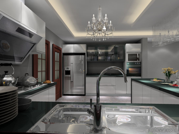 廚房與客廳隔開作為單獨的房間有效的隔開油煙與潮濕,左邊吊柜下方設計開放架可方便放置茶杯等小物件。中間的位置是窗口所以水盆的位置安裝在窗口下面,洗碗的時候可邊看風景邊工作不會顯得枯燥無味。