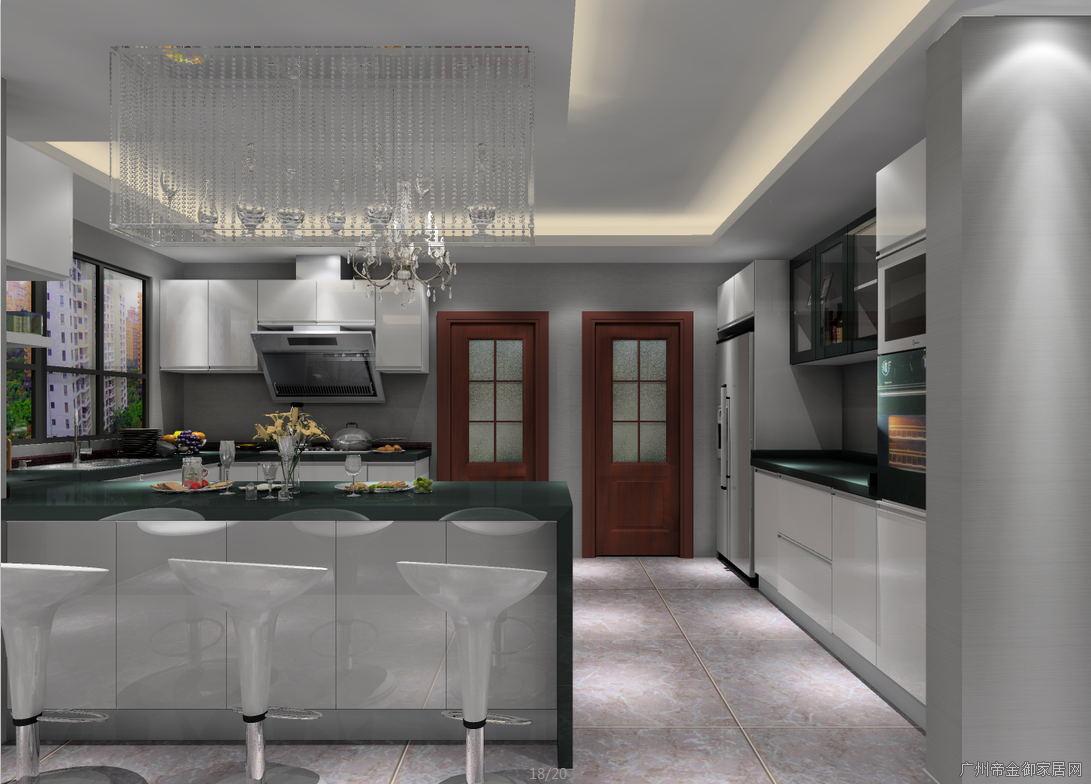 櫥柜左邊地柜延伸下來為吧臺在用餐階段可在此位置進行用餐,櫥柜臺面設計往下延伸至地面符合當下時尚設計標準。