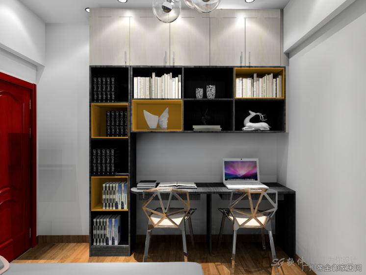 主人房對(duì)面空間則制作書柜,閑暇時(shí)間看看書或辦公都可在房間進(jìn)行,書桌長(zhǎng)度為1.5米正好適合兩人座位,層板間隔高度為A4紙大小,放置大小書籍完全沒問題,顏色的搭配選擇與衣柜相同的黑色會(huì)顯得空間色澤比較為統(tǒng)一,層板間隔加入了橙色元素,不會(huì)顯得空間顏色感過于單調(diào),上方柜子直接做到頂空間收納與美感更為優(yōu)秀!