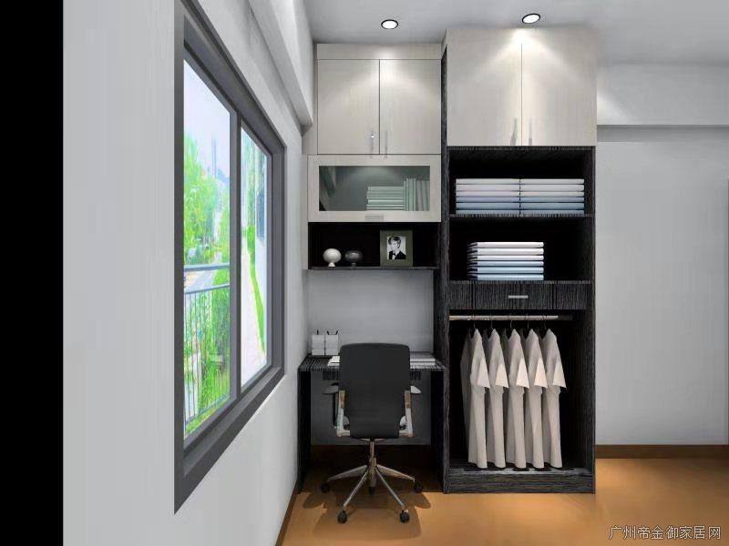 衣柜主要以掛衣服為主,左邊層板放置疊衣服,上邊平開門可放置棉被或行李箱整個(gè)空間收納模式較為優(yōu)秀、簡(jiǎn)單、實(shí)用。顏色搭配選擇了黑色+木紋給人感覺較為安靜睡眠方面更為舒暢。